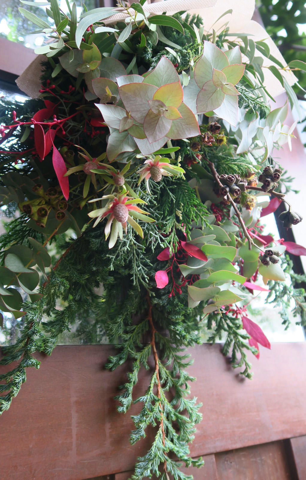 リング状のベースに花やグリーンを組み合わせた飾りです