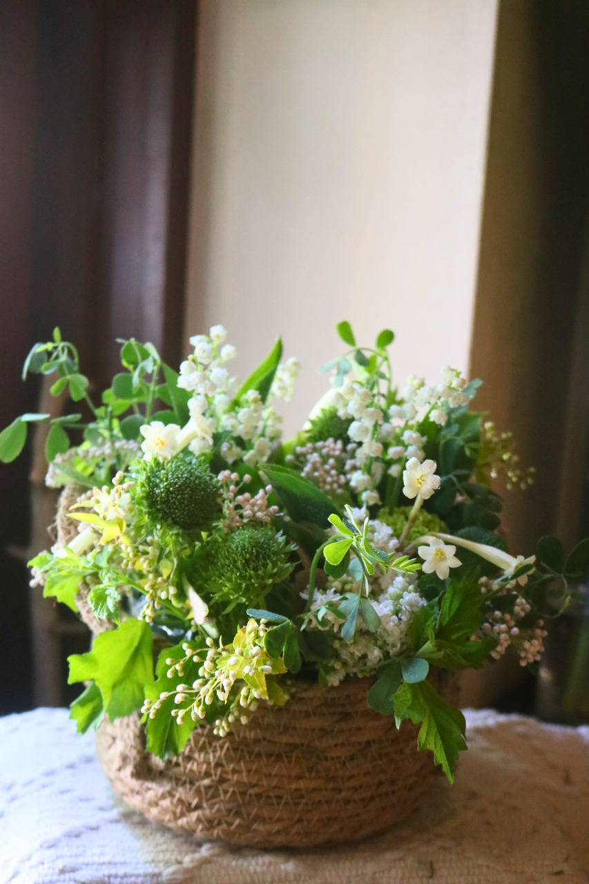 可憐なスズランとグリーンをたっぷりとあしらいます。